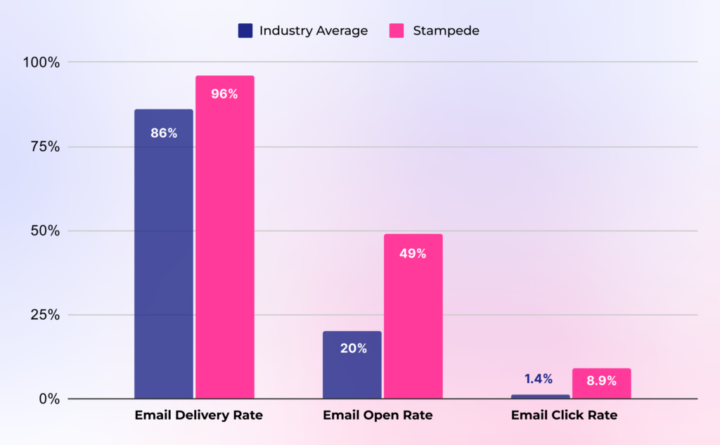Stampede emails have a higher delivery rate than the industry average with open rates being 2x higher and click rates even 6x higher. That’s a significant difference for all figures.